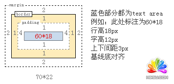 如果我们设置一个12号字的输入框,那么前端会对这个输入框设定结构。text area(蓝色部分)他是个基础,pading(内白色部分)他是text area和框描边的空隙,border(黄色部分)是框的描边宽度,margin(黄色外虚线框范围)他是鼠标划过的hover状态的延伸区域。我们的12号字是在text area里面的。比如图中,我们的text area设置的行高是18像素,字高12像素,居中的,上下各有3像素的间距。