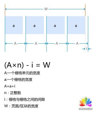 在网页设计中,我们把宽度为“W”的页面分割成n个网格单元“a”,每个单元与单元之间的间隙设为“i”,此时我们把“a+i”定义“A”。他们之间的关系如下: