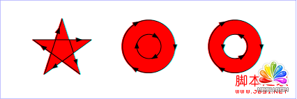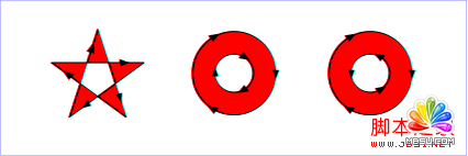 3. 稍微复杂一点的是fill-rule属性。这个属性定义了判断点是不是属于填充范围的算法;除了inherit这个值外,还有两个取值: prop-value">nonzero:这个值采用的算法是:从需要判定的点向任意方向发射线,然后计算图形与线段交点的处的走向;计算结果从0开始,每有一个交点处的线段是从左到右的,就加1;每有一个交点处的线段是从右到左的,就减1;这样计算完所有交点后,如果这个计算的结果不等于0,则该点在图形内,需要填充;如果该值等于0,则在图形外,不需要填充。看下面的示例: