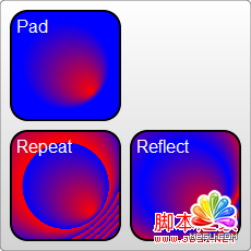 另外一个可能用到的属性是spreadMethod属性,这个属性定义了渐变色到达它的终点时应该采取的行为。该属性有3个可选值:pad(默认值),reflect,repeat。pad不用说了,属于自然过渡,渐变色结束以后,使用最后一个成员色直接渲染对象剩下的部分。refect会让渐变色继续,只不过渐变色会反向继续渲染,从最后一个颜色开始到第一个颜色这个顺序渲染;等到再次到达渐变色终点时,再反序,如此这般指导对象填充完毕。repeat也会让渐变色继续渲染,但是不会反序,还是一遍一遍从第一种颜色到最后一种颜色渲染。效果图如下所示: