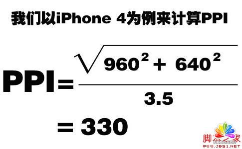 PPI,有时也叫DPI,所表示的是每英寸所拥有的像素(pixel)数目,数值越高,即代表显示屏能够以越高的密度显示图像。(注:这里的像素, 指的是device pixels。)搞清楚了PPI是什么意思,我们就能很容易理解PPI的计算方式了,我们需要首先算出手机屏幕的对角线等效像素,然后处以对角线(我们平 常所说的手机屏幕尺寸就是说的手机屏幕对角线的长度),就可以得到PPI了。准确的计算公示大家可以参照下图。比较有意思的是,根据公式计算出来的 iPhone 4的PPI为330,要比苹果官方公布的326要高一点点。