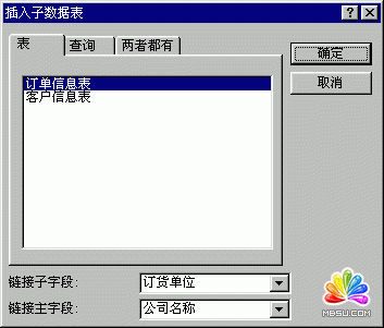 在列表框中选取“表”----“订单信息表”,然后在“链接子字段”组合框中选取“订货单位”字段,并在“链接主字段”组合框中选取“公司名称”字段,单击“确定”按钮就可以在主数据表“客户信息表”中重新插入子数据表“订单信息表”了。必须要注意的是在任何一个数据表中插入子数据表都需要在两个表之间建立“关系”,如果这两个表的“主链接字段”和“子链接字段”之间还没有建立联结的话,在单击“确定”按钮插入“子数据表”的时候就会询问是否要在这两个表之间建立相应的“关系”,只有建立“关系”以后,才能完成“插入子数据表”过程。用这样的方式在表之间建立“关系”不像在“关系”对话框中建立的“关系”那样直观。所以我们提倡在关系对话框中建立好表与表之间的“关系”,由Access自动地创建子数据表。