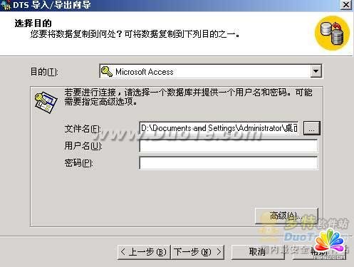 3.进入导出到目标数据源的选择,这里我们要转成ACCESS的数据库。注意选择数据源类型为“Microsoft Access。点 “文件名(F)” 后面的按钮选择目标.MDB文件。