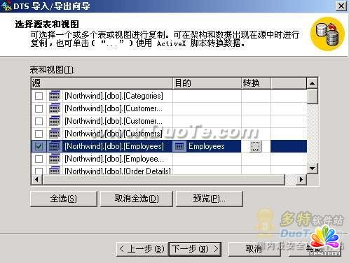 5.我们注意这里选表的时候右边有一个“转换”列。SQL导出只转换数据类型并不考虑其他脚本所以我们遇到的自动编号问题也就出在这里。有自动编号的一定要点选“转换”。