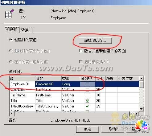 6.我们回看到一个“列映射和转换”对话框。有注意到自增的employeeid int 自增这里变成了Access里的long这肯定不对,long并不是自动编号,只好修改建表脚本,图片上那个红圈里的按钮“编辑SQL”。