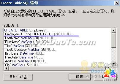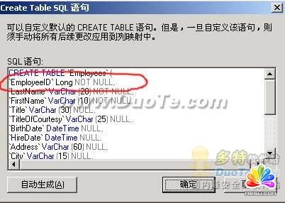 红圈中的脚本就是employeeid 的 Access建表脚本,在 "NOT NULL" 前面加上 "IDENTITY (1, 1)"。