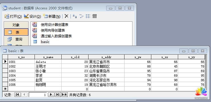 例如有如下的Access数据库student,表basic,以及6条记录,现在通过几种方式在Jsp中将他们的数据显示出来。如图所示: