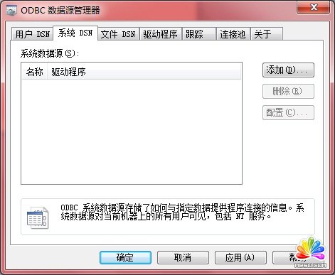 1、对于这种方式,首先要建立ODBC数据源,我的系统是Win7系统,所以依次选择“控制面板----管理工具----数据源(ODBC)”,打开数据源管理器,如图所示: