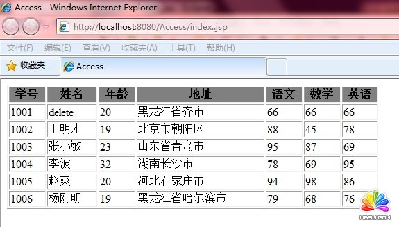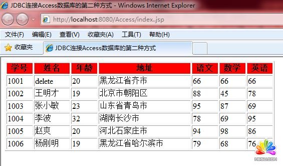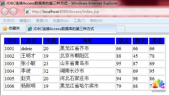 <%@ page language="java" import="java.util.*,java.sql.*" contentType="text/html; charset=UTF-8" pageEncoding="UTF-8"%><!DOCTYPE html PUBLIC "-//W3C//DTD HTML 4.01 Transitional//EN" "http://www.w3.org/TR/html4/loose.dtd"><html> <head> <title>JDBC连接Access数据库的第三种方式</title> </head> <body> <table border="1" width="40%"> <tr bgcolor="blue"> <th>学号</th> <th>姓名</th> <th>年龄</th> <th>地址</th> <th>语文</th> <th>数学</th> <th>英语</th> </tr> <% String path = application.getRealPath("/index.jsp"); path = path.substring(0,path.lastIndexOf("\\"))+"\\"; Class.forName("sun.jdbc.odbc.JdbcOdbcDriver"); String url = "jdbc:odbc:driver={Microsoft Access Driver (*.mdb)};DBQ="+path+"student.mdb "; Connection con = DriverManager.getConnection(url); Statement st = con.createStatement(); String sql = "select * from basic"; ResultSet rs = st.executeQuery(sql); while(rs.next()) { %> <tr> <td><%=rs.getString(1) %></td> <td><%=rs.getString(2) %></td> <td><%=rs.getInt(3) %></td> <td><%=rs.getString(4) %></td> <td><%=rs.getInt(5) %></td> <td><%=rs.getInt(6) %></td> <td><%=rs.getInt(7) %></td> </tr> <% } rs.close(); st.close(); con.close(); %> </table> </body></html>运行JSP结果如下所示: