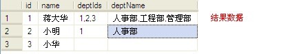 - --此时已将员工表所存的IDS分别与部门相关联,下面需要将此集合中的deptName聚合成一个记录