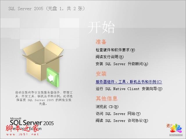然后选择安装——服务器组件、工具、联机丛书和示例