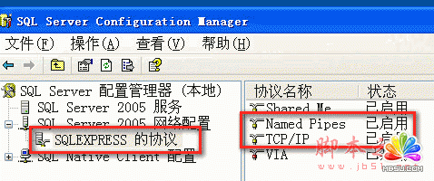 5、开启SQL Server 2005的网络协议TCP/IP和管道命名协议并重启网络服务。