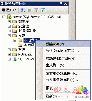 (1)首先我们在发布服务器上(winserver2003)打开SqlServer2005 Management Studio (企业版)。在“对象资源管理器”中找到复制节点,右键--->新建发布(注:如果你的SqlServer是express版本的话,是没有发布这一功能的,只有订阅功能!)
