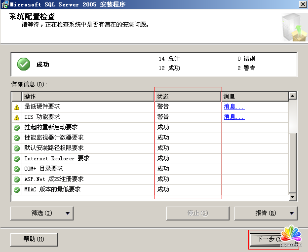第七步:检查系统配置,正常是没有警告信息。警告信息是提示系统没有安装完成的组件。