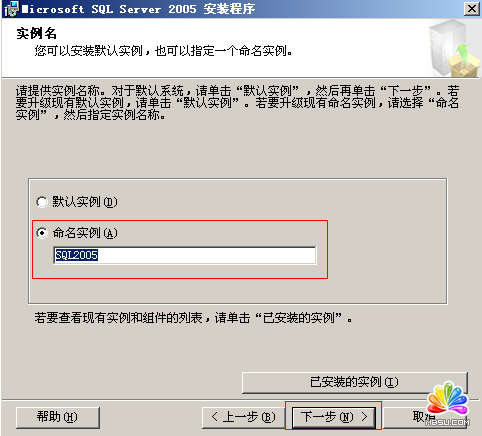 第十步:选择安装的数据库的实例名称,一般选择默认。如果您的机器上已装有SQL2000,在此必须选择“命名实例”,输入一个新的实例名称。