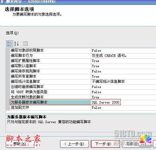 -- 在接下来的"选择脚本选项"中, 找到"为服务器版本编写脚本"项, 选择"SQL Server 2000"