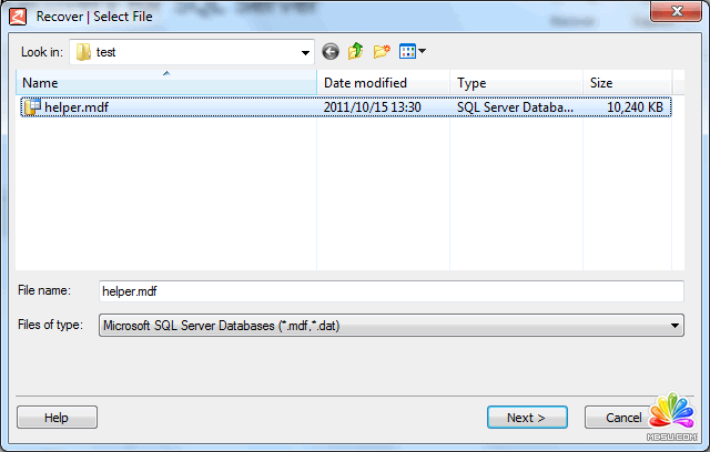 2. 点击菜单中的 File > Recover,选择要恢复的数据库的数据文件(.mdf)