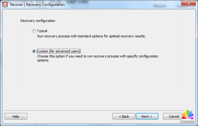 3. Next > Next,进入 Recovery Configuration 界面,选择Custom(选择了Custom才可以选择从日志中恢复误删除的数据)。