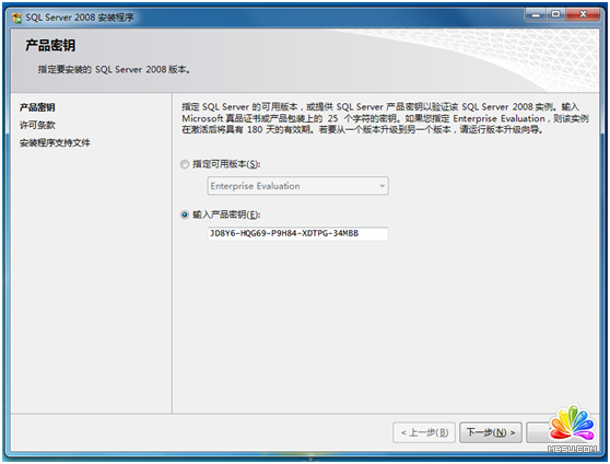 接下来是SQL Server2008版本选择和密钥填写,本文以“Enterprise Evaluation”为例介绍安装过程,密钥可以向Microsoft官方购买,如图1-6所示。