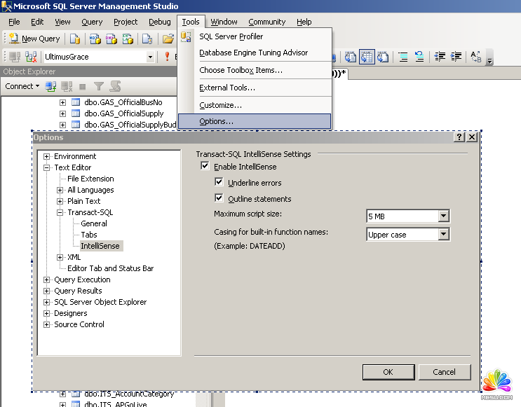 选择Tools-->Options打开选项页面,依次展开Text Editor-->Transact-SQL-->IntelliSense显示如下图所示的配置页面,检查是否勾选了Enable IntelliSense选项。注意修改配置后要打开新的查询页面才起作用。