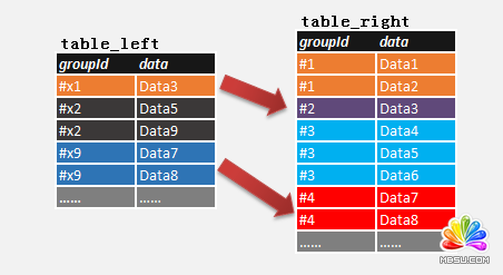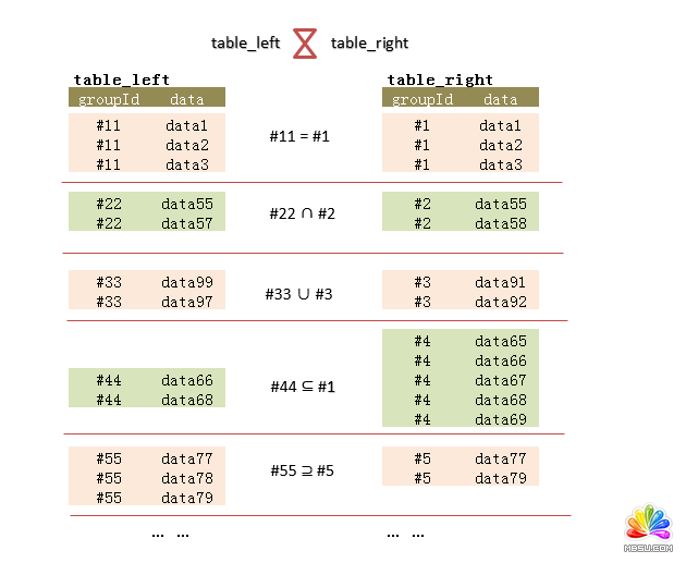 检查表table_left的各组(groupId),是否在表table_right中存在有一组(groupId)数据(data)与它的数据(data)完全相等.