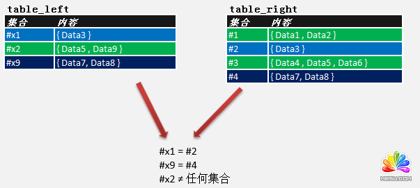只要(#11 à #2 )或 (#2 à #11 )的"Except"集运算结果有记录,就说明两组的数据不相等。