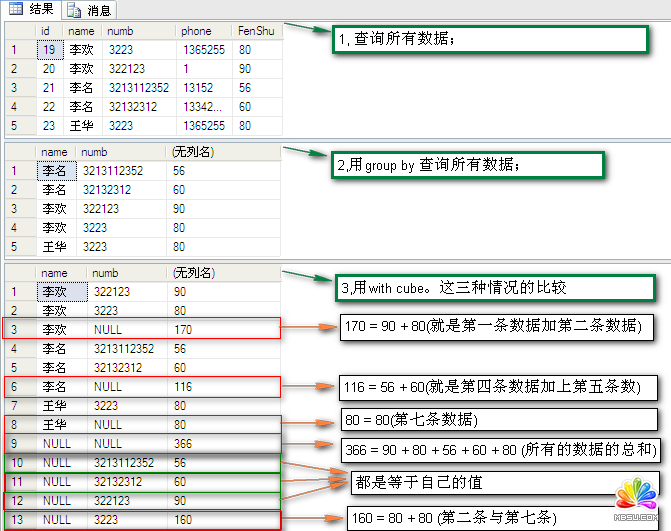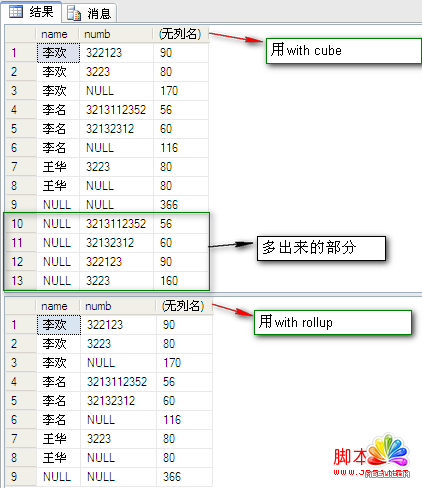 用第三种(用with cube)为什么会多出来有null的字段值呢?通过分析图上的值得组合会发现是怎么回事儿了,以第三条数据(李欢,null,170)为例:它只是把姓名是【李欢】的分为了一组,而没有考虑【numb】,所以有多出来了第三条数据,也说明了170是怎么来的。其他的也是这样。再回顾一下帮助文档的解释:CUBE 生成的结果集显示了所选列中值的所有组合的聚合, 发现明了了许多。
