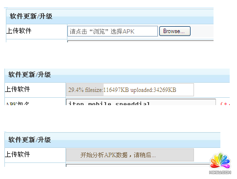 上传APK,显示上传进度条,上传完成开始分析APK,并显示:正在分析apk数据,请稍后... ,分析完成后,显示:上传成功,重新上传