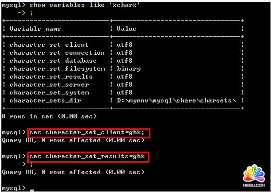 6、在mysql安装的时候设置字符集为UTF-8,而在mysql客户端(cmd进入的界面)向表中添加中文的数据 无法添加到数据库中,则按下面设置即可: