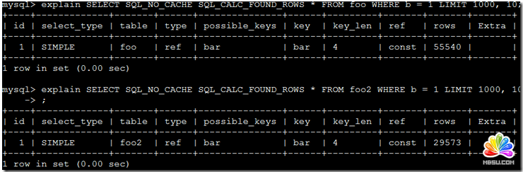 mysql_query("SELECT SQL_NO_CACHE SQL_CALC_FOUND_ROWS * FROM foo2 WHERE b = 1 LIMIT 1000, 10");