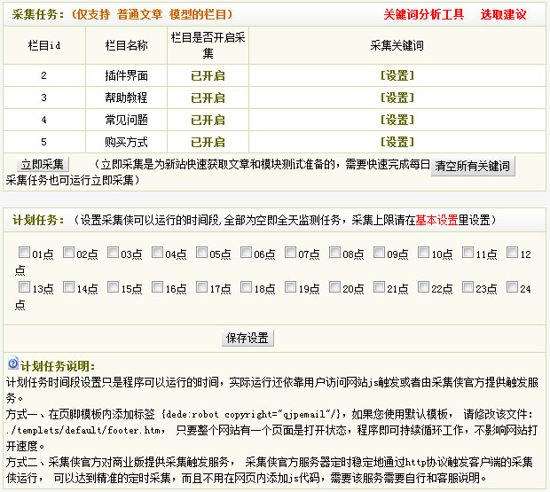 免费版:每个栏目可添加1个关键词进行采集,高级设置、伪原创、搜索优化功能不可用,无远程触发定时定量采集更新服务,无技术支持。