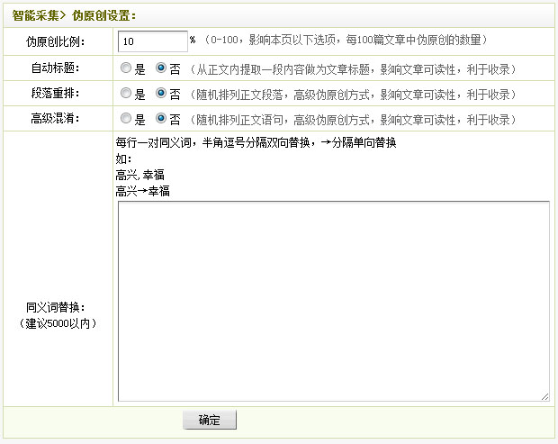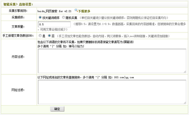 自动标题、段落重排、高级混淆、自动内链、内容过滤、网址过滤、同义词替换、插入seo词语、关键词添加链接等多种方法手段对采集回来的文章加工处理,增强采集文章原创性,利于搜索引擎优化,提高搜索引擎收录、网站权重及关键词排名。