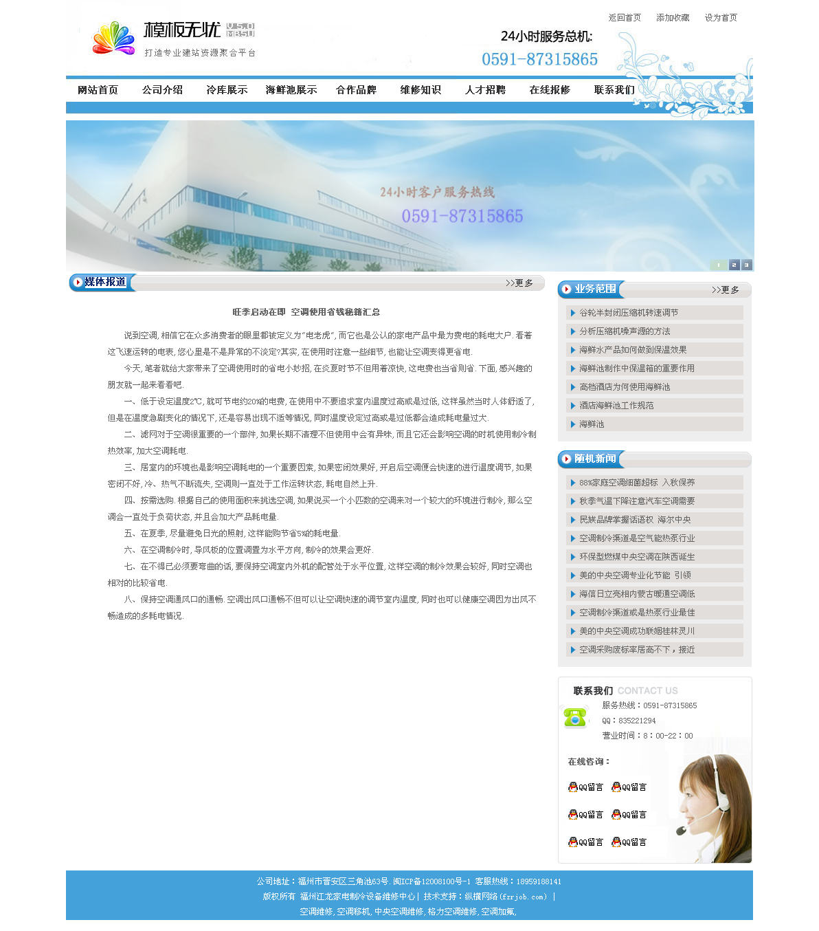 dedecms家电制冷设备维修企业模版,采用织梦5.7 GBK内核制作,蓝色通用企业模板,适合各类企业网站.整站无错,大气简约,div+css编写,便于优化和修改,如果您不会安装,可联系我免费安装.