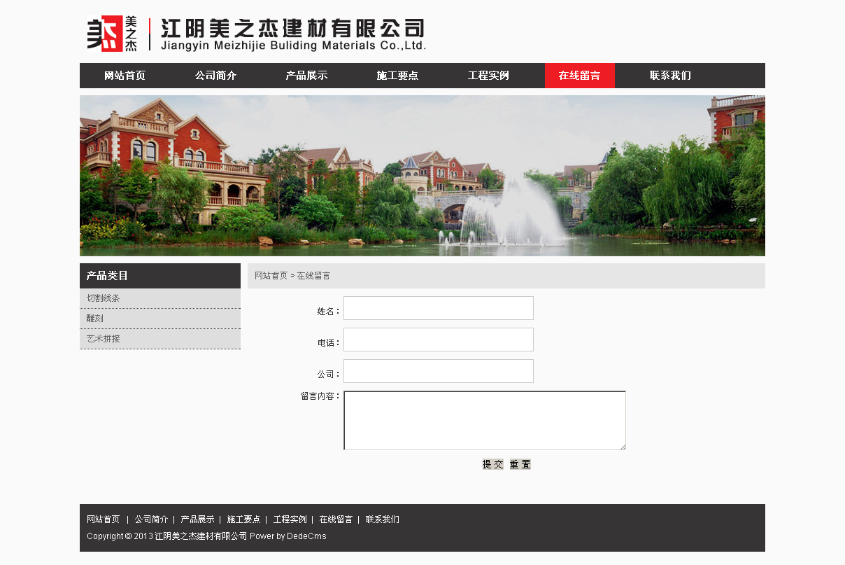 dedecms工程建材房产企业模板整站简约黑色大气,模版内容主要包括江阴美之杰建材有限公司是一家专业生产(EPS装饰线条)建筑装饰线条的股份企业,产品涉足外墙装饰线条、外墙外保温系统、特种干粉建材、水性建筑涂料、防水材料等相关产品。主要技术指标达到欧美国家同类产品水平,在业内享有较高的声誉和地位。