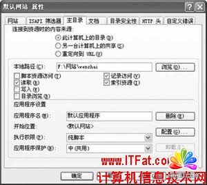 2.设置Wed服务器安装好IIS后,还需要对其做一些简单的设置。打开控制面板中的“管理工具→Internet信息服务”,然后在窗口左侧依次打开“本地计算机→网站→默认网站”,在默认网站上点右键选属性,打开“默认网站属性”窗口。在“网站”标签的“IP地址”中选择“全部未分配”,其他项默认;选择“主目录”标签, “连接到资源时的内容来源”单选项中选择“此计算机上的目录”,然后在“本地路径”中指定主页所在的位置(如图2);打开“文档”标签,选中“启用默认文档”,然后单击“添加”按钮,输入网站首页名,一般是“index.htm”。