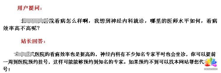 现在很少医疗站站长会考虑到增添一个网站问答栏目,因为大家都认为用户不会有那么多空闲到问答栏目上向网站提问题。事实的确如此,但是我们却忽略了一个细节,问答栏目完全可以自问自答,并间接创造网站内容。因此笔者在这里建议大家,如果你现在使用的网站没有开设问答板块,可以寻找技术人员或者自己开发一个问答板块,可以参照一下笔者网站上的这个模板: