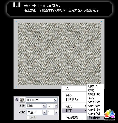 1.1 新建一个800*600px的画布,在上方画一个比画布稍大的矩形,应用如图所示图案填充