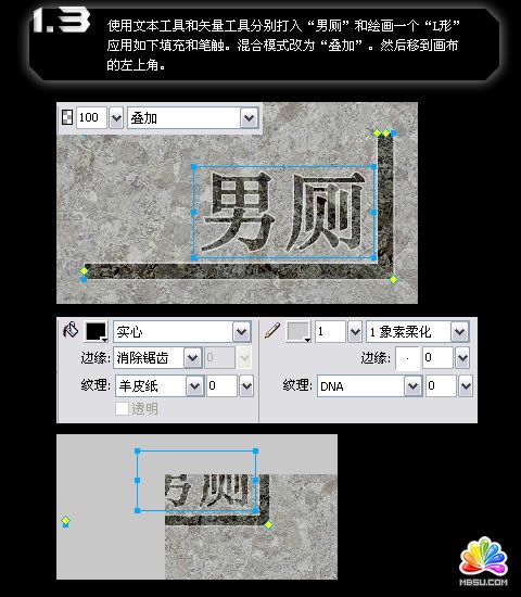 1.3 使用文本工具和矢量工具分别打入“男厕”和绘画一个“L形”