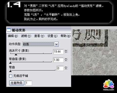 1.4 对“男厕”二字和“L形”应用EyeCandy的“摇动变形”滤镜,参数如图所示。