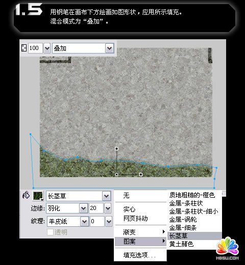 1.5 用钢笔在画布下方绘画如图形状,应用所示填充。混合模式为“叠加”。