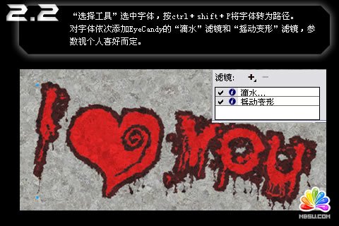 对字体依次添加EyeCandy的“滴水”滤镜和“摇动变形”滤镜,参数视个人喜好而定。