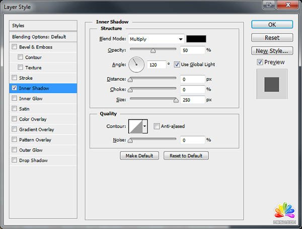 2、给木纹图层添加图层样式,选择内阴影,参数及效果如下图。