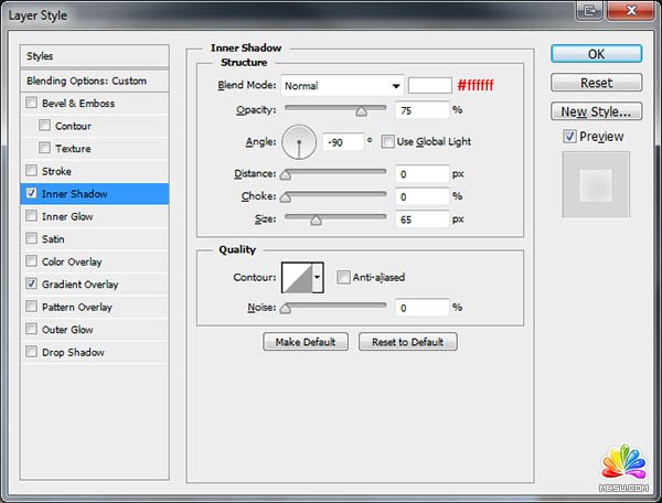 5、给圆角矩形设置图层样式,分别设置混合选项、内阴影、渐变叠加,参数及效果如下图。