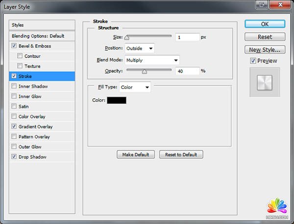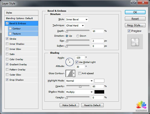 13、给小圆添加图层样式,分别设置:斜面和浮雕、描边、渐变叠加、投影,参数及效果如下图。