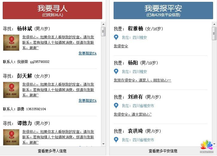 最新数据显示,百度贴吧寻人平台目前已成功找到了36人。此外为了让更多的力量参与并扩散贴吧寻人平台,百度除整合贴吧、搜狗、360、一淘及微博等寻人数据外,百度贴吧还推出“雅安地震寻人数据库”,并呼吁媒体及站长共同救难。