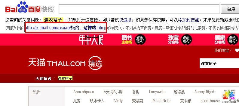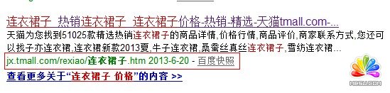 笔者在百度搜索引擎里面搜索关键词【连衣裙】,虽然很多网站目前仍在采用拼音或者英文作为URL,但搜索很顺利,在百度的第二页,搜索到了天猫的连衣裙专栏,如图所示: