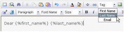 InnovaStudio WYSIWYG Editor has a Custom Tag Insertion feature. With this feature, you can insert predefined custom tags into the current Editor content. Custom Tag insertion is a feature that is commonly used in mailing applications or template editing in web content management systems. To use Custom Tag Insertion feature, set CustomTagList property with an array of your Custom Tags in the form of ["Caption", "Custom Tag"], for example :
