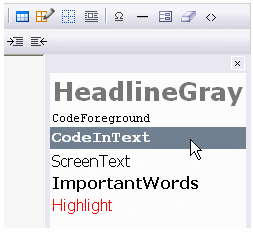 All class selectors defined in the css file will be listed in the Style Selection. For example, the class selector CodeInText below will be included in the Style Selection.