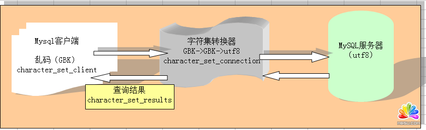 首先,通过mysql客户端,将数据发送给Mysql服务器,经过字符集转换器的时候,由于character_set_connection 值为gbk,所以会将客户端发送过来的数据转为gbk格式,紧接着,字符集转换器将数据要传送给服务器的时候,发现服务器是以utf8保存数据的,所以,在其内部会自动将数据由gbk转换成utf8格式