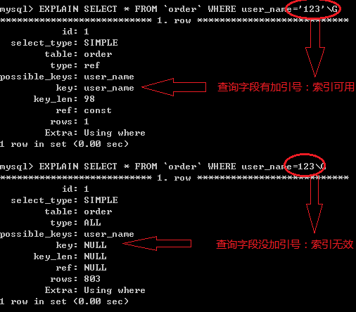 4.如果列类型是字符串,那一定要在条件中将数据使用引号引用起来,否则不使用索引